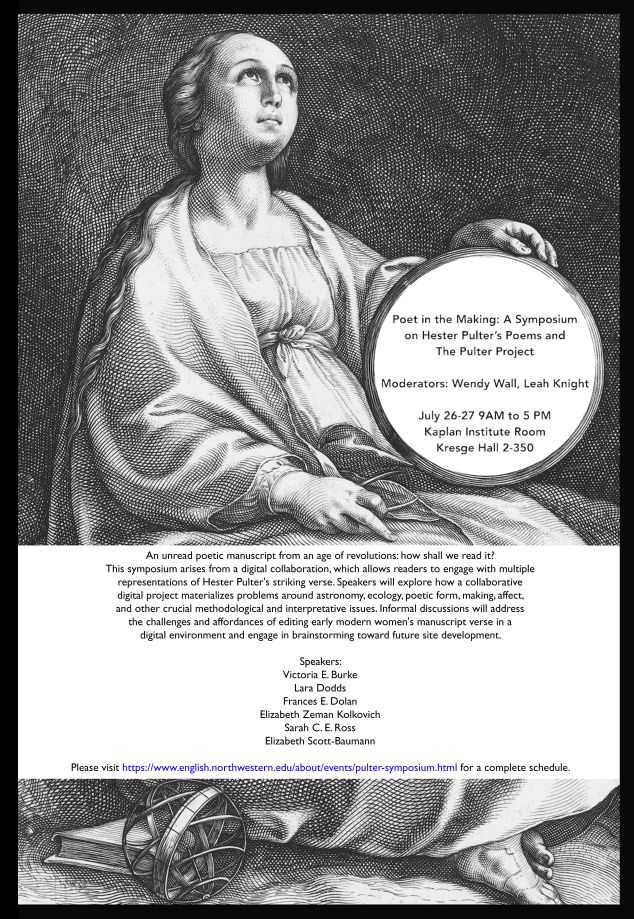 A SYMPOSIUM ON HESTER PULTER’S POEMS AND THE PULTER PROJECTJULY 26 and 27, 2018The event is free, but please email Wendy Wall by July 16, 2018 to register. KAPLAN SEMINAR ROOMKresge Hall 2-350 1880 Campus Drive Evanston, IL 60208 NORTHWESTERN UNIVERSITY [map] |